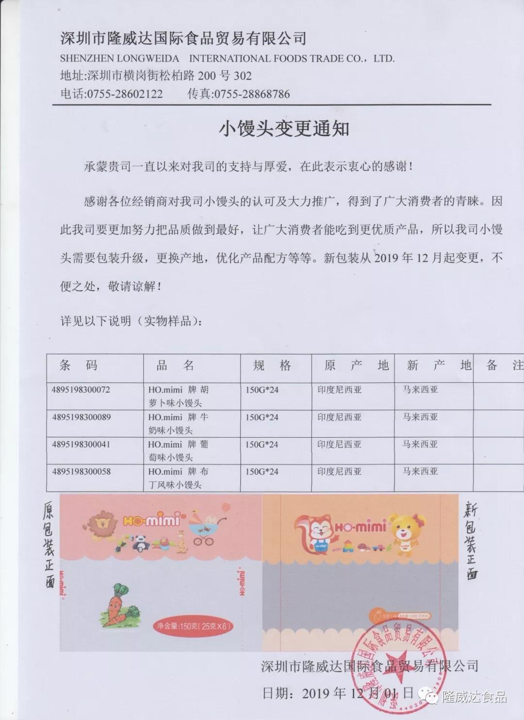 關于本公司HO.mimi牌150g小(xi≤λ<φǎo)饅頭的(de)變更通(tōng)知(zhī)