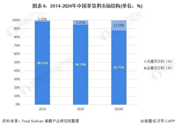根據Frost & Sullivan統計(jì)數(shù)據,♥♠在我國(guó)茶飲料市(shì)場(chǎng)$↕'♣中,含糖茶飲料市(shì)場(chǎng)仍然是(sh&∑ì)我國(guó)茶飲料的(de)主要(yào)市(shì)場(←∑chǎng),但(dàn)是(shì)無糖茶飲料的(de)市(shì)場↕∏±(chǎng)份額卻呈現(xiàn)明(míng)顯的(de)占比增加的(d∑♠e)趨勢,2014-2019年(nián),我國(guó)無糖茶飲料市(sh>₩♣ì)場(chǎng)占比從(cóng)2014年(ni÷↔♣án)的(de)1.53%增長(cháng)到(dà∑÷✔÷o)了(le)5.21%,并且預計(jì)到(dào)2024我國(★©≈♣guó)無糖茶飲料的(de)市(shì)場(chǎng)™ε≈占比将增長(cháng)到(dào)12.29%。