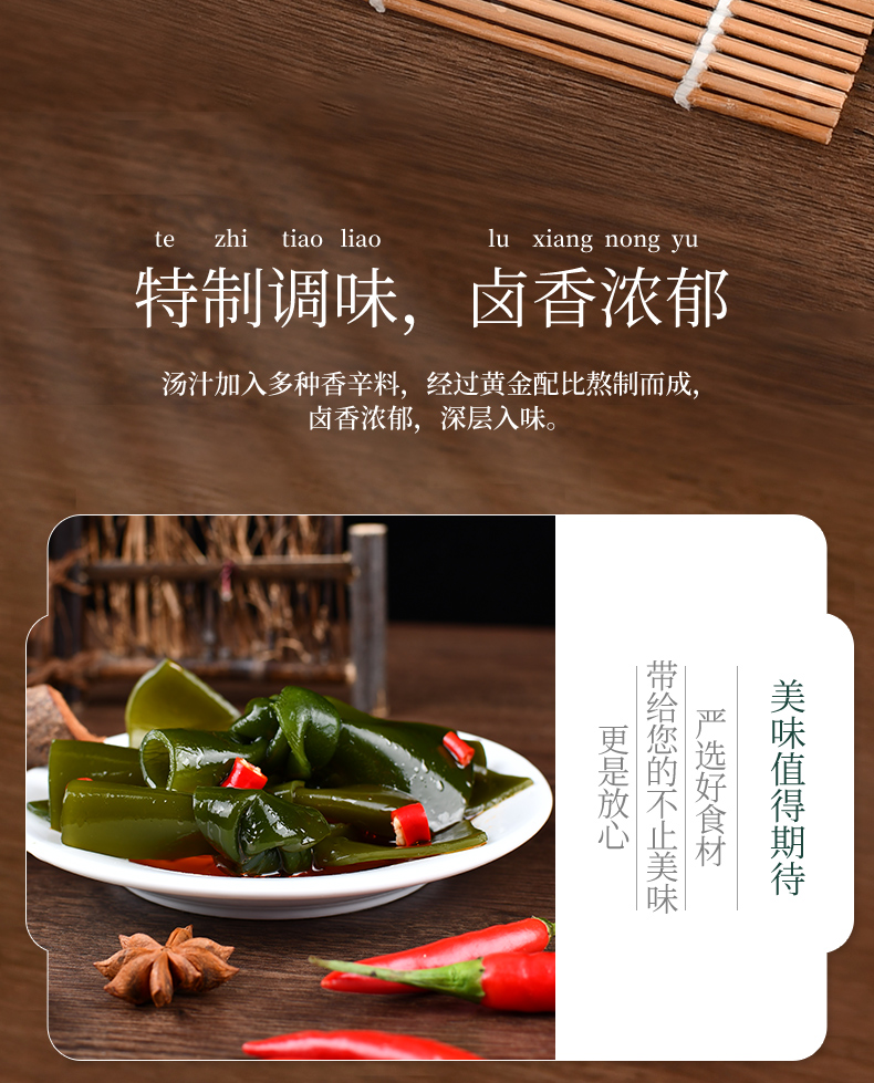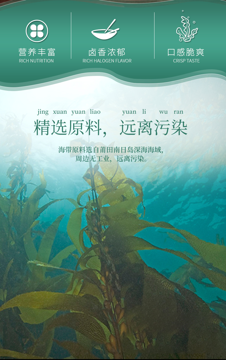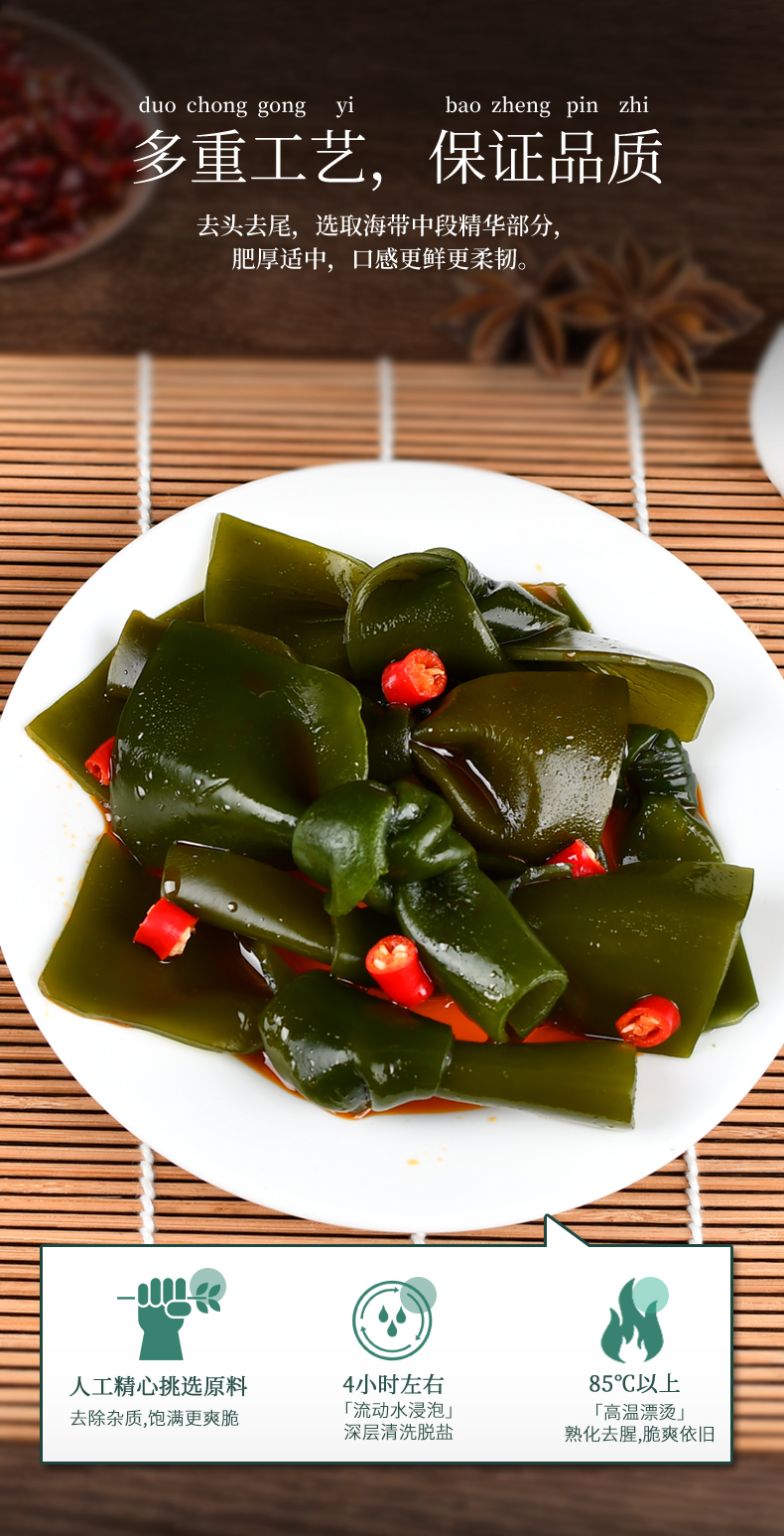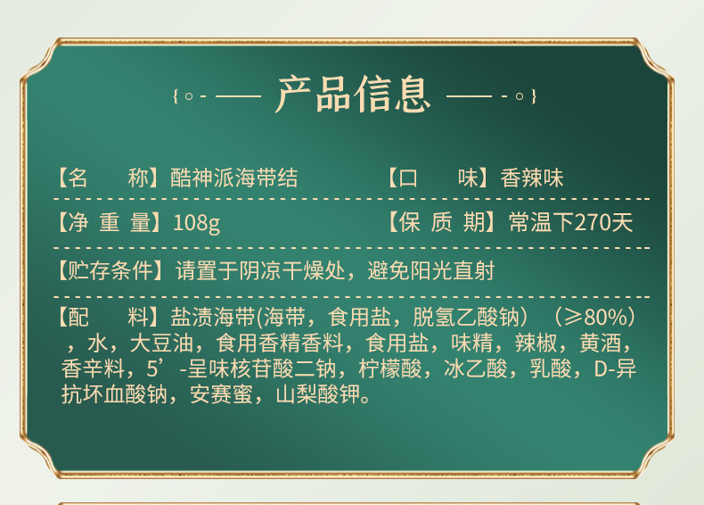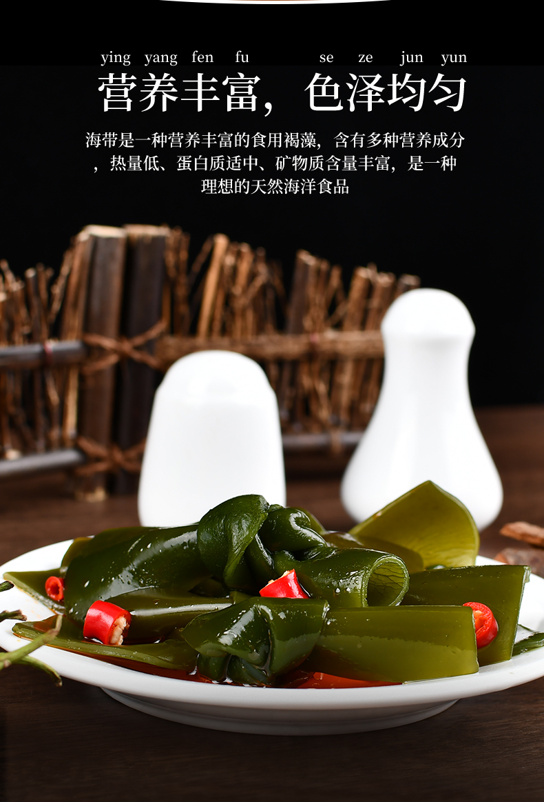 鹽漬海(hǎi)帶(海(hǎi)帶,食用(yòng)鹽,脫 £®"氫乙酸鈉)(≥80%),水(shuǐ),×±¥§大(dà)豆油,食用(yòng)香精香料,食用(yòng)鹽,味精,辣椒β∏,黃(huáng)酒,香辛料,5’-呈味核苷酸二鈉,檸檬©σ酸,冰乙酸,乳酸,D-異抗壞血酸鈉,安賽蜜,山(shān ≈∑)梨酸鉀。