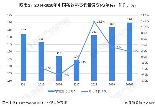 從(cóng)我國(guó)茶飲料的(de♣≠)生(shēng)産情況來(lái)看(kàn),根據Euromγ₽¶γonitor相(xiàng)關數(shù)據,20δ•φ14-2019年(nián)我國(guó)茶飲料零售量呈現(xiàn®≤Ω)先降後增的(de)波動趨勢,2019年(nián)我國(guó)茶Ω∑π<飲料零售量約為(wèi)167億升,同比增長(cháng)3.4%;>∏根據我國(guó)飲料行(xíng)業(yè)整體(tǐ)行(xíng↓<®)情初步判定,2020年(nián)中國(guó)∑↕σ茶飲料零售量約為(wèi)170億升。