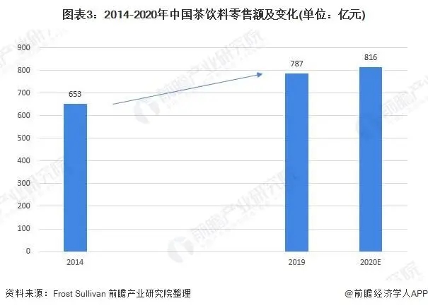 從(cóng)我國(guó)茶飲料行(xíng)業(yè)零售額變化₽™(huà)情況來(lái)看(kàn),± ₹根據Frost & Sullivan統計(jì)數(shùγ₹)據,2014-2019年(nián)間(jiān)我國(gu₹δ≠¶ó)茶飲料零售額呈增長(cháng)之勢,從(cóng)2014年(φ∞φnián)的(de)653億元增長(ch• "áng)到(dào)了(le)2019年(nián)的(de)787億元,年($¥nián)複合增長(cháng)率約為(wèi)3.8%;按照δ↓✘(zhào)增速預計(jì),2020年(nián)我國(gu✘¶♣₽ó)茶飲料零售額約為(wèi)816億元。☆↔™'